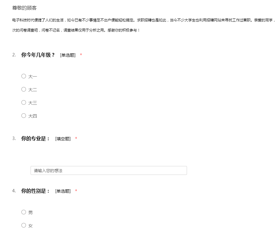 电子科技时代便捷了人们的生活,如今已有不少事情足不出户便能轻松搞定。求职招聘也是如此,当今不少大学生也利用招聘网站来寻找工作过兼职。亲爱的同学,你是否使用过招聘网站求职呢?快来参与我们此次的问卷调查吧,问卷不记名,调查结果仅用于分析之用。感谢你的积极参与!