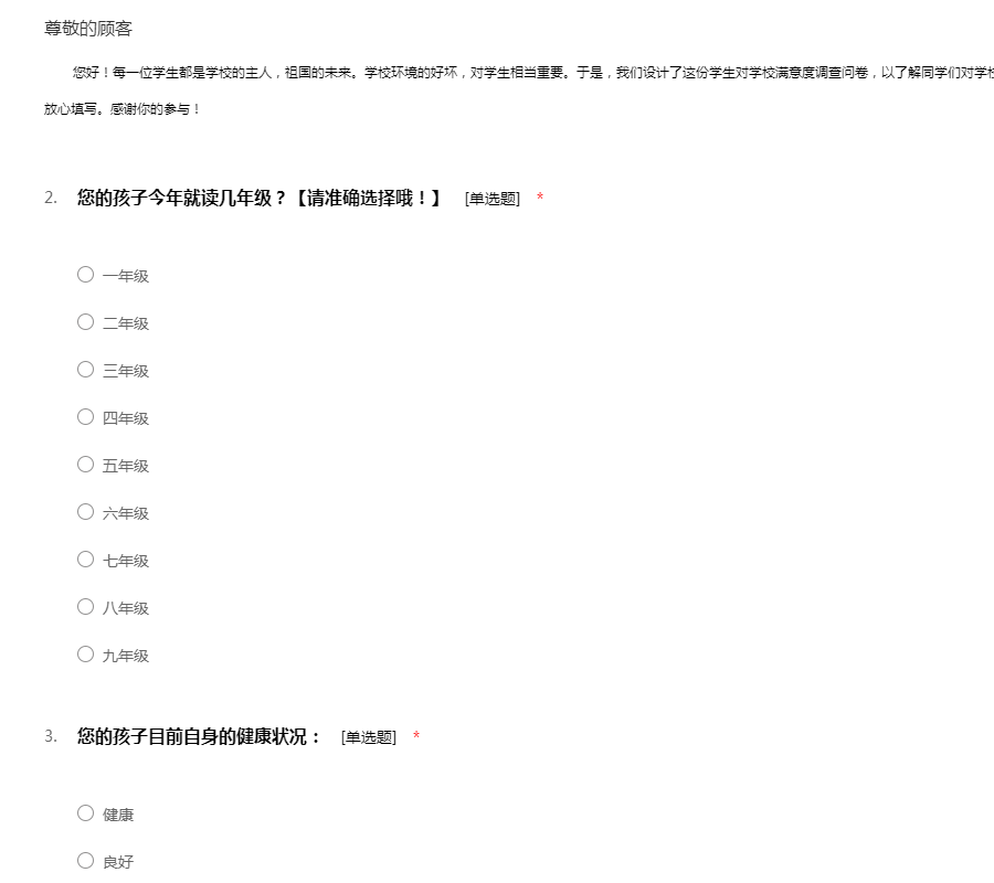 ——您好!每一位学生都是学校的主人,祖国的未来。学校环境的好坏,对学生相当重要。于是,我们设计了这份学生对学校满意度调查问卷,以了解同学们对学校的满意程度。本问卷采取不记名的方式,所以请放心填写。感谢你的参与!