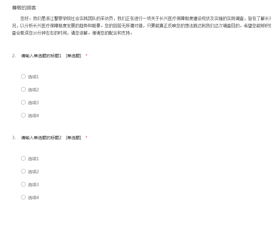 您好:我们是浙江警察学院社会实践团队的采访员,我们正在进行一项关于长兴医疗保障制度建设现状及实施的实践调查,旨在了解长兴医疗保障制度建设现状及实施的基本情况,以分析长兴医疗保障制度发展的趋势和前景。您的回答无所谓对错,只要能真正反映您的想法就达到我们这次调查目的。希望您能够积极参与,我们将对您的回答完全保密。调查会耽误您10分钟左右的时间,请您谅解。谢谢您的配合和支持。