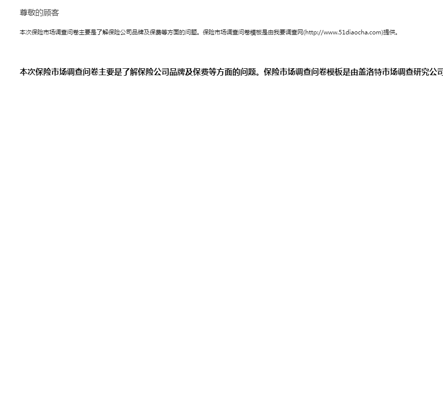 本次保险市场调查问卷主要是了解保险公司品牌及保费等方面的问题。保险市场调查问卷模板是由我要调查网(http://www.51diaocha.com)提供。