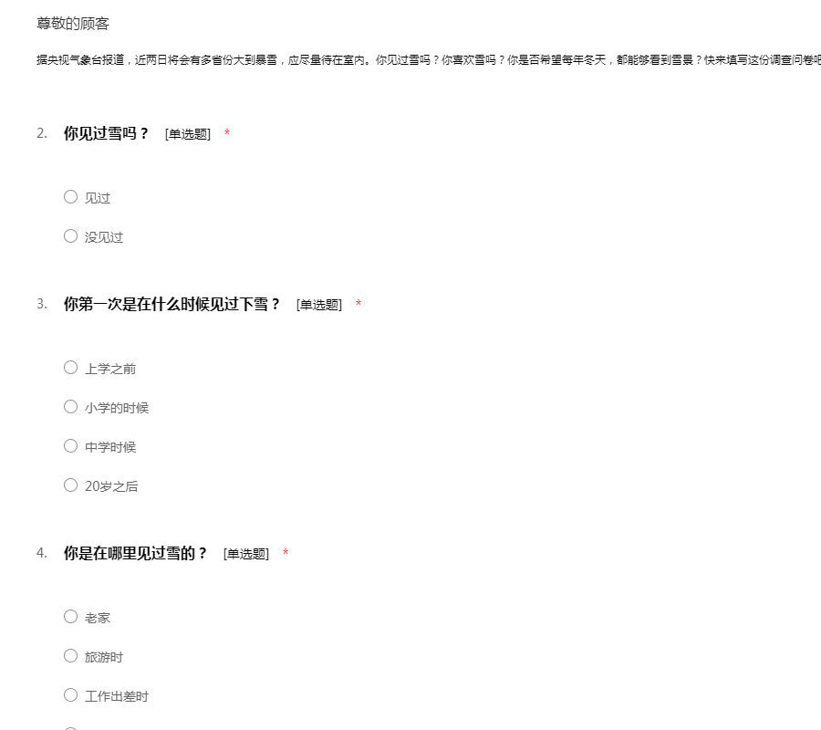 据央视气象台报道,近两日将会有多省份大到暴雪,应尽量待在室内。你见过雪吗?你喜欢雪吗?你是否希望每年冬天,都能够看到雪景?快来填写这份调查问卷吧,把你对雪的喜爱程度留下吧!