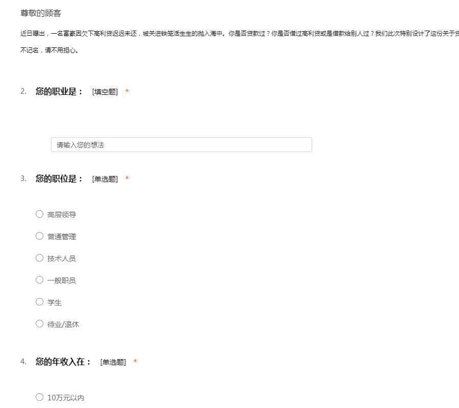 近日曝出,一名富豪因欠下高利贷迟迟未还,被关进铁笼活生生的抛入海中。你是否贷款过?你是否借过高利贷或是借款给别人过?我们此次特别设计了这份关于贷款需求的市场调查问卷,欢迎你前来填答。问卷不记名,请不用担心。