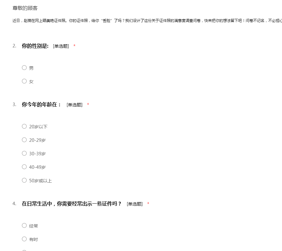 近日,赵薇在网上晒美艳证件照。你的证件照,给你“丢脸”了吗?我们设计了这份关于证件照的满意度调查问卷,快来把你的想法留下吧!问卷不记名,不必担心。欢迎你的积极参与哟~~