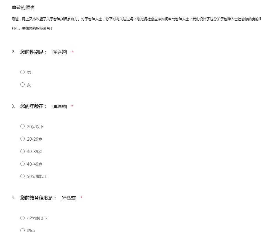 最近,网上又热议起了关于智障指挥家舟舟。对于智障人士,您平时有关注过吗?您觉得社会应该如何帮助智障人士?我们设计了这份关于智障人士社会接纳度的问卷调查表,欢迎您的参与。问卷不记名,请不必担心。感谢您的积极参与!