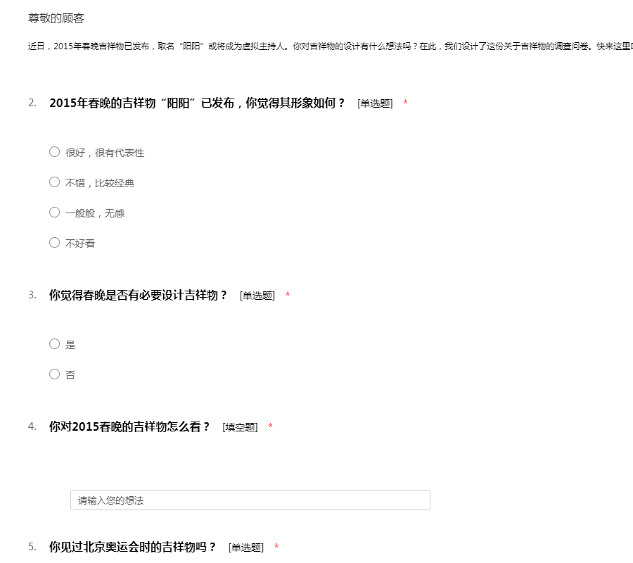 近日,2015年春晚吉祥物已发布,取名“阳阳”或将成为虚拟主持人。你对吉祥物的设计有什么想法吗?在此,我们设计了这份关于吉祥物的调查问卷。快来这里吐槽吧!