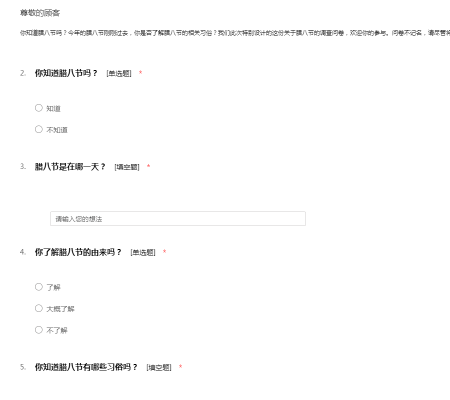 你知道腊八节吗?今年的腊八节刚刚过去,你是否了解腊八节的相关习俗?我们此次特别设计的这份关于腊八节的调查问卷,欢迎你的参与。问卷不记名,请尽管将你的真实想法留下吧!