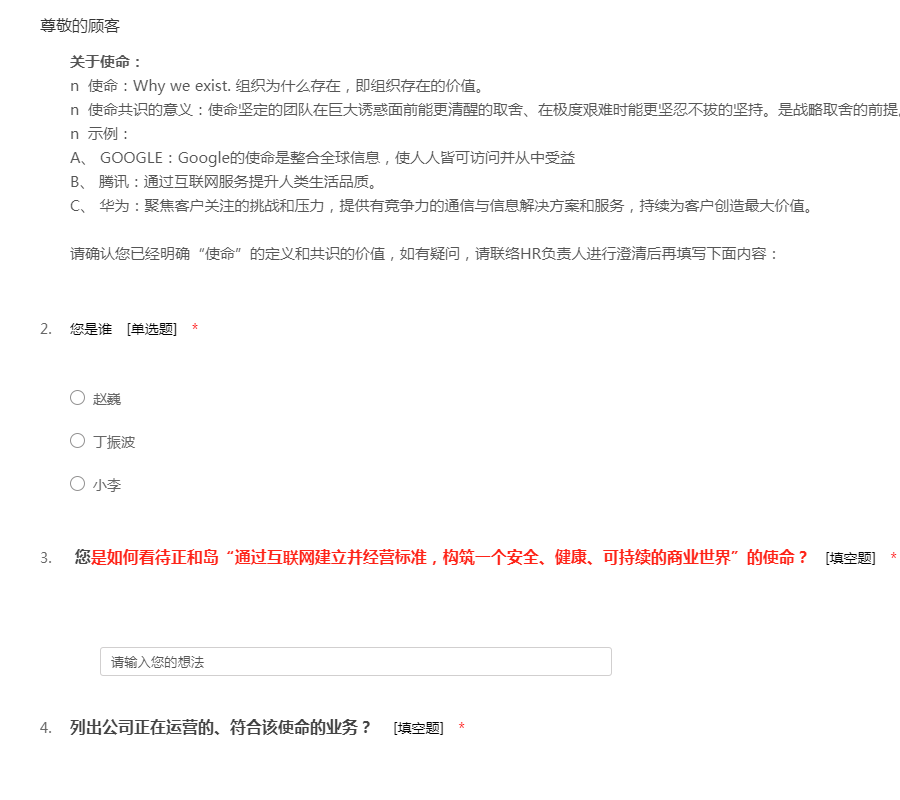 请确认您已经明确“使命”的定义和共识的价值,如有疑问,请联络HR负责人进行澄清后再填写下面内容: