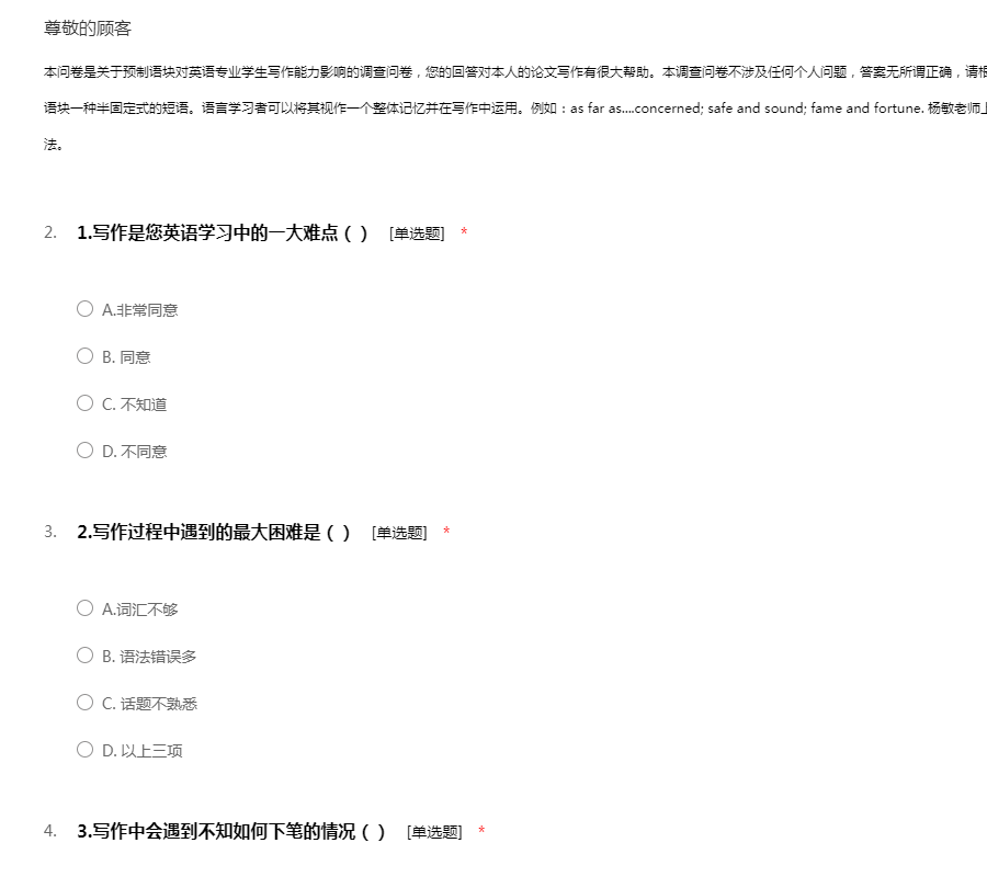 本问卷是关于预制语块对英语专业学生写作能力影响的调查问卷,您的回答对本人的论文写作有很大帮助。本调查问卷不涉及任何个人问题,答案无所谓正确,请根据您的真实情况做出选择。谢谢您的配合!预制语块一种半固定式的短语。语言学习者可以将其视作一个整体记忆并在写作中运用。例如:as far as....concerned; safe and sound; fame and fortune. 杨敏老师上课运用的教学方法就是典型的预制语块教学方法。
