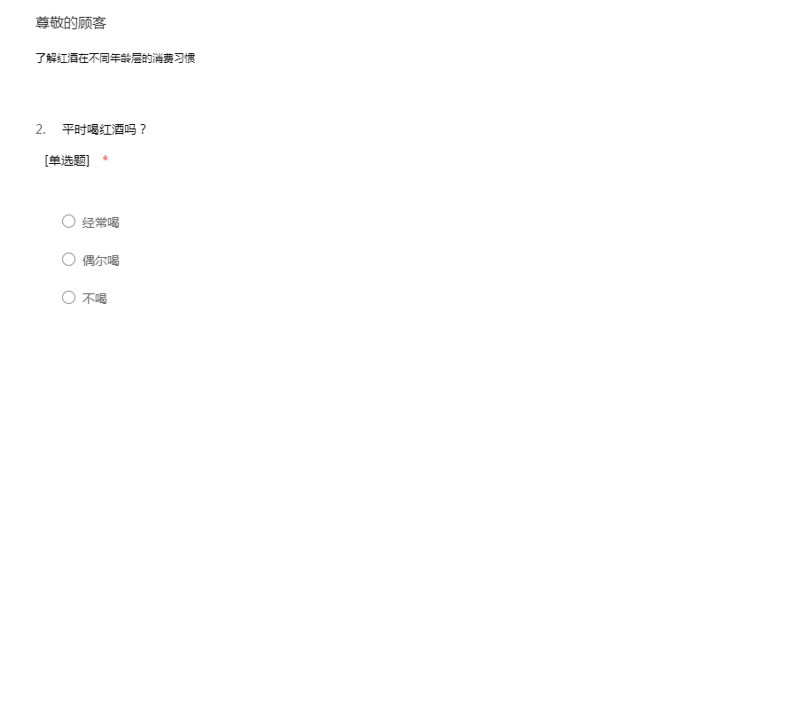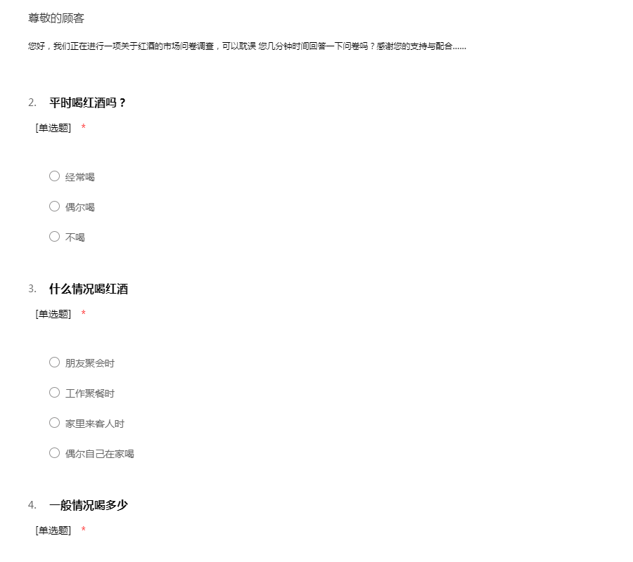您好,我们正在进行一项关于红酒的市场问卷调查,可以耽误 您几分钟时间回答一下问卷吗?感谢您的支持与配合……