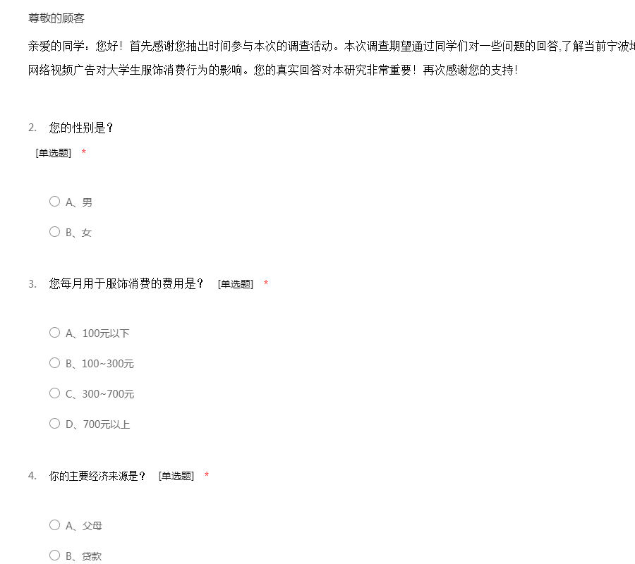 亲爱的同学:您好!首先感谢您抽出时间参与本次的调查活动。本次调查期望通过同学们对一些问题的回答,了解当前宁波地区大学生的基本服饰消费情况,分析网络视频广告对大学生服饰消费行为的影响。您的真实回答对本研究非常重要!再次感谢您的支持!