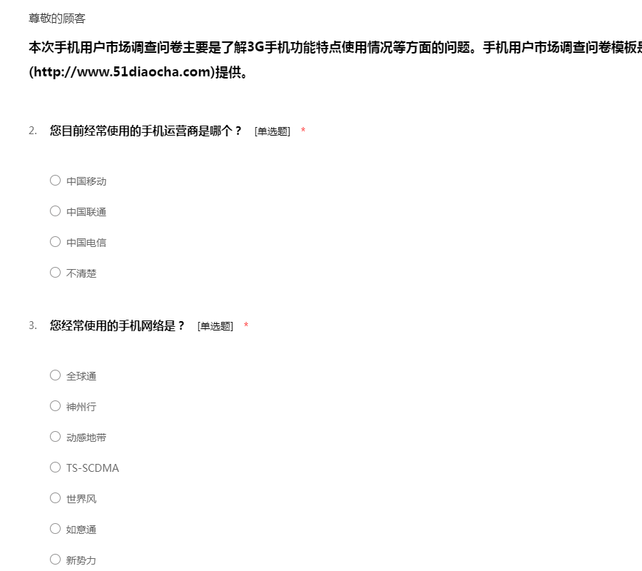 本次手机用户市场调查问卷主要是了解3G手机功能特点使用情况等方面的问题。手机用户市场调查问卷模板是由我要调查网(http://www.51diaocha.com)提供。