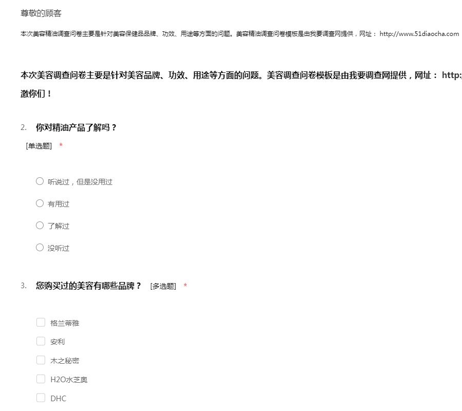 本次美容精油调查问卷主要是针对美容保健品品牌、功效、用途等方面的问题。美容精油调查问卷模板是由我要调查网提供,网址: http://www.51diaocha.com