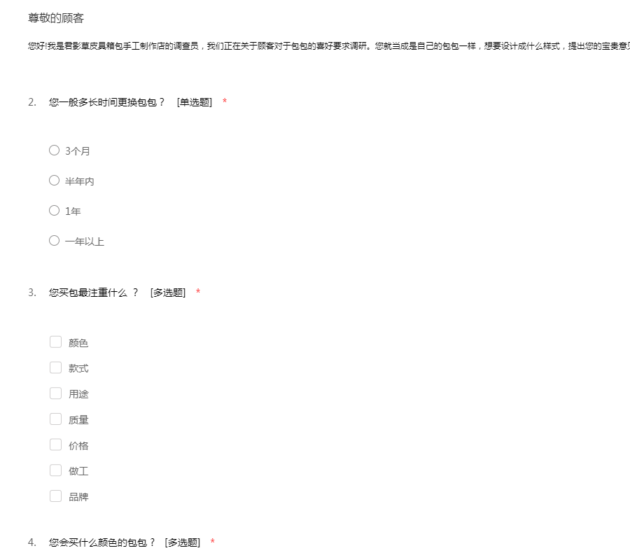 您好!我是君影草皮具箱包手工制作店的调查员,我们正在关于顾客对于包包的喜好要求调研。您就当成是自己的包包一样,想要设计成什么样式,提出您的宝贵意见,我们需要您的帮助,我们感激不尽。