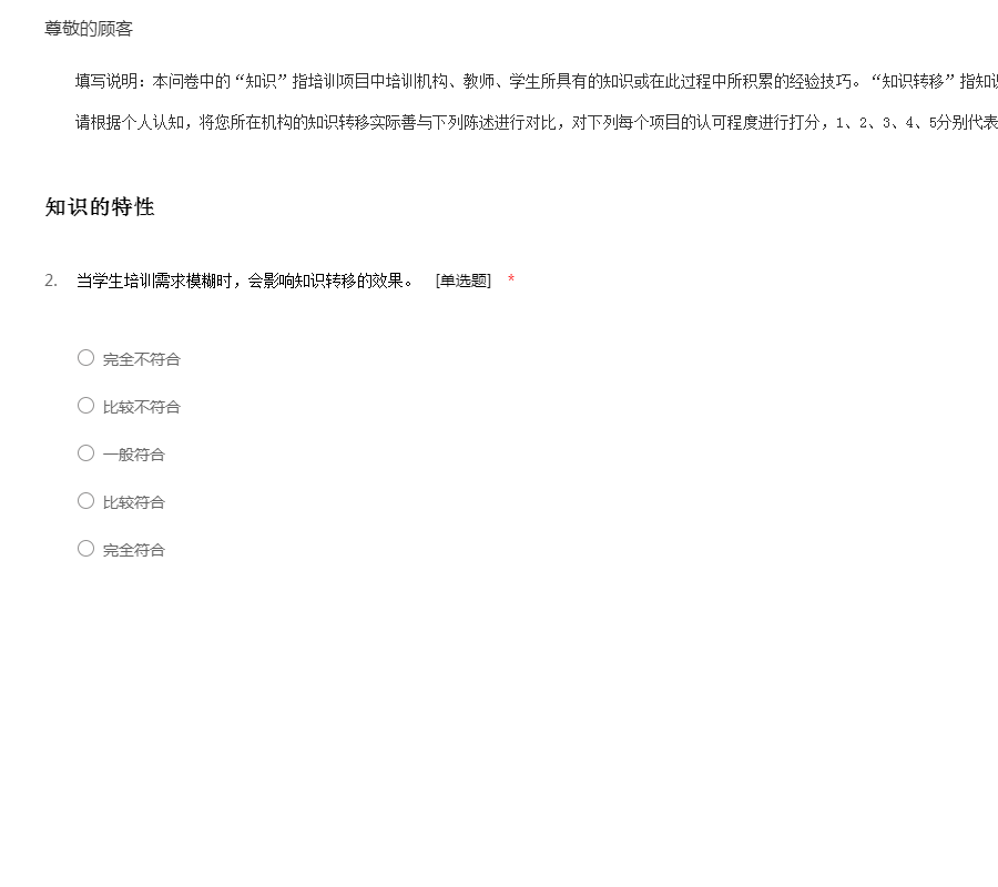 填写说明:本问卷中的“知识”指培训项目中培训机构、教师、学生所具有的知识或在此过程中所积累的经验技巧。“知识转移”指知识在机构内部、教师、学生之间的流动及共享。请根据个人认知,将您所在机构的知识转移实际善与下列陈述进行对比,对下列每个项目的认可程度进行打分,1、2、3、4、5分别代表完全不符合、比较不符合、一般符合、比较符合、完全符合。