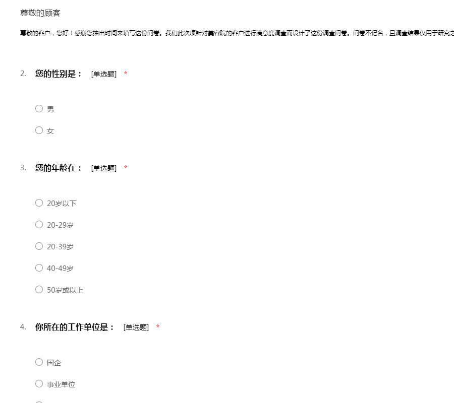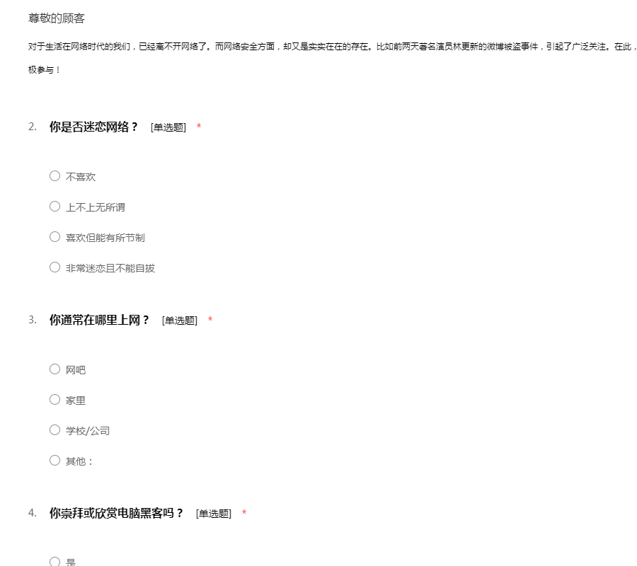 工作环境:包含工作管理环境和周边的自然环境,还有工作的安全性:该要项的设置目的是用于测量您的员工如何看待诸如他们的工作环境条件、设备工具的质量以及在工作场所当中对于安全的整体意识等方面问题。每一个组织都要对员工的健康和安全负责。一个缺乏安全保障的工作环境将导致各类事故、法律诉讼和工作延迟等一系列问题。所有这些事故可能给您的组织带来非常巨大的损失。该要项下的所有问题将调查您的员工对于公司的设施工具是否满意,他们是否相信工作是在以一种安全的方式进行,以及提供给他们的工具设备是否能够满足他们去安全成功地完成工作。员工工作环境满意度问卷模板由我要调查网(http://www.51diaocha.com)提供。