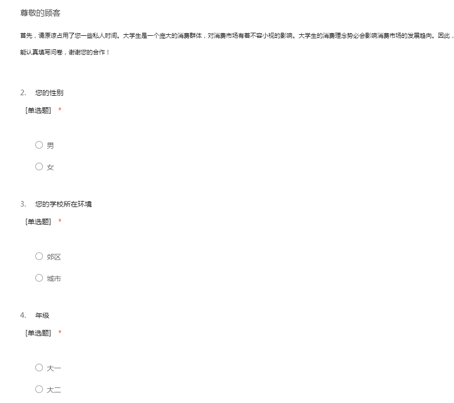 首先,请原谅占用了您一些私人时间。大学生是一个庞大的消费群体,对消费市场有着不容小视的影响。大学生的消费理念势必会影响消费市场的发展趋向。因此,我们希望就大学生的消费情况进行调查。希望您能认真填写问卷,谢谢您的合作!