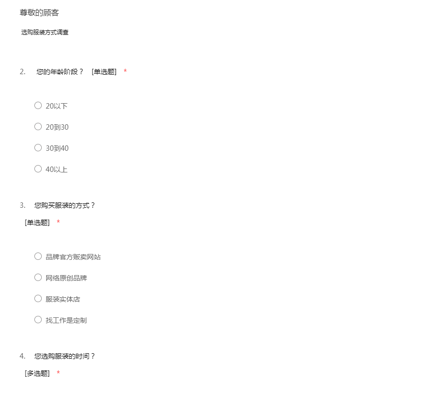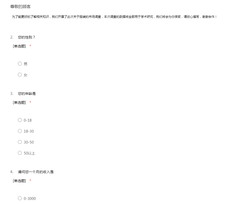 为了能更好的了解相关知识,我们开展了此次关于服装的市场调查,本次调查的数据将全部用于学术研究,我们将会为你保密,请放心填写,谢谢合作!