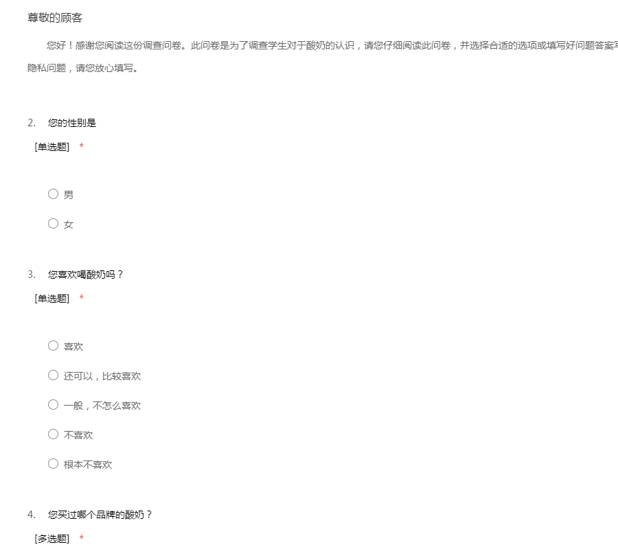 您好!感谢您阅读这份调查问卷。此问卷是为了调查学生对于酸奶的认识,请您仔细阅读此问卷,并选择合适的选项或填写好问题答案写在相应的位置。此问卷不涉及任何个人隐私问题,请您放心填写。
