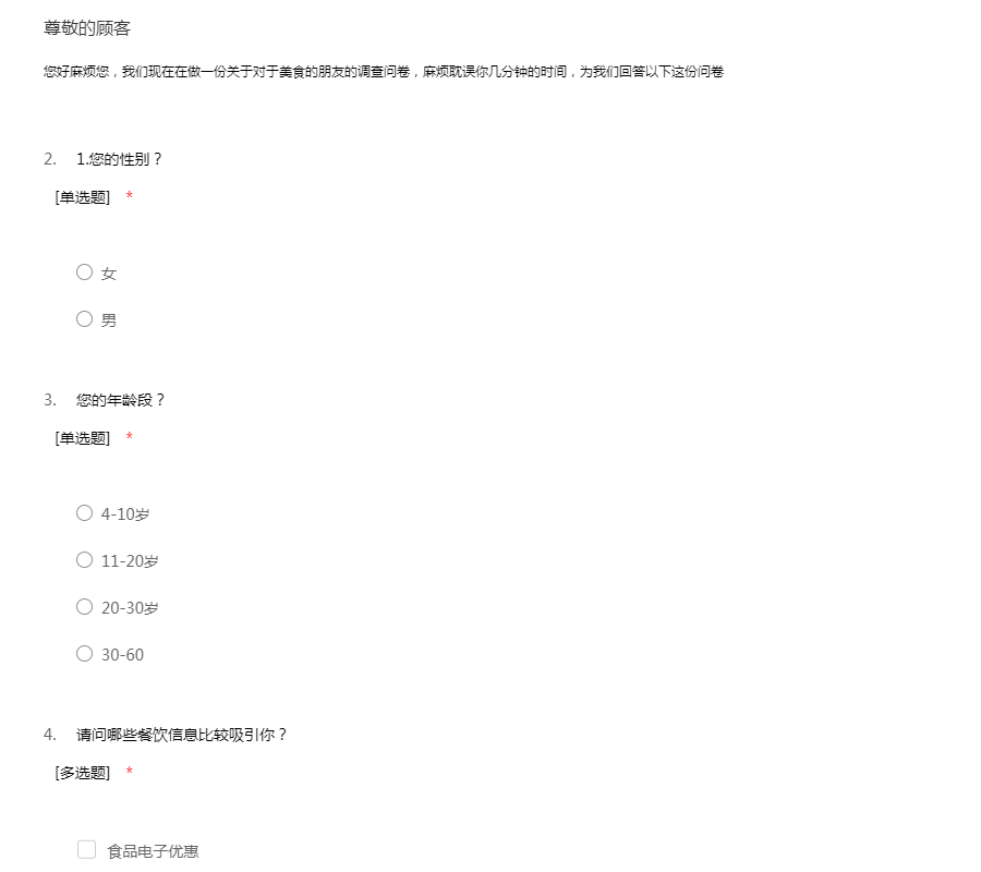 您好麻烦您,我们现在在做一份关于对于美食的朋友的调查问卷,麻烦耽误你几分钟的时间,为我们回答以下这份问卷