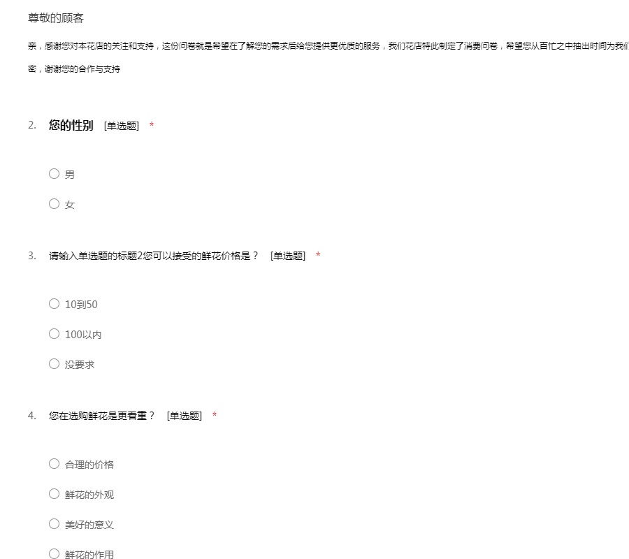亲,感谢您对本花店的关注和支持,这份问卷就是希望在了解您的需求后给您提供更优质的服务,我们花店特此制定了消费问卷,希望您从百忙之中抽出时间为我们提出您宝贵的建议,我们会对您的回答给予保密,谢谢您的合作与支持