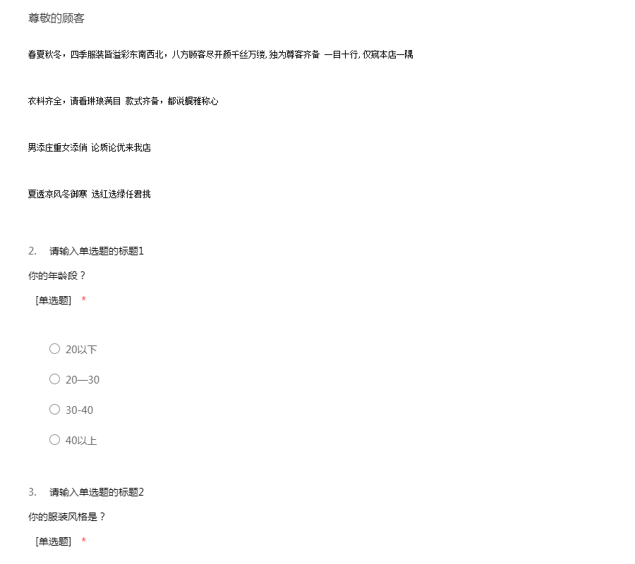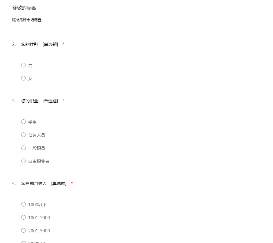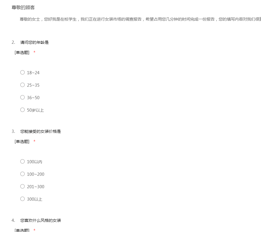 尊敬的女士,您好我是在校学生,我们正在进行女装市场的调查报告,希望占用您几分钟的时间完成一份报告,您的填写内容对我们很重要,希望得到您的合作