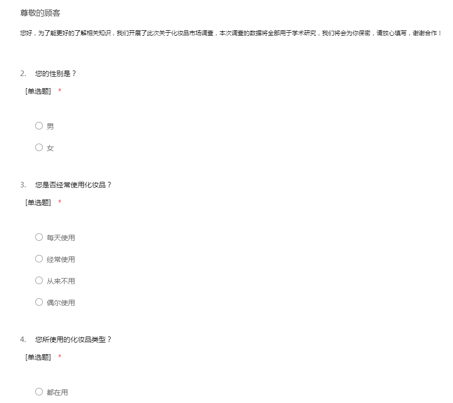 您好,为了能更好的了解相关知识,我们开展了此次关于化妆品市场调查,本次调查的数据将全部用于学术研究,我们将会为你保密,请放心填写,谢谢合作!