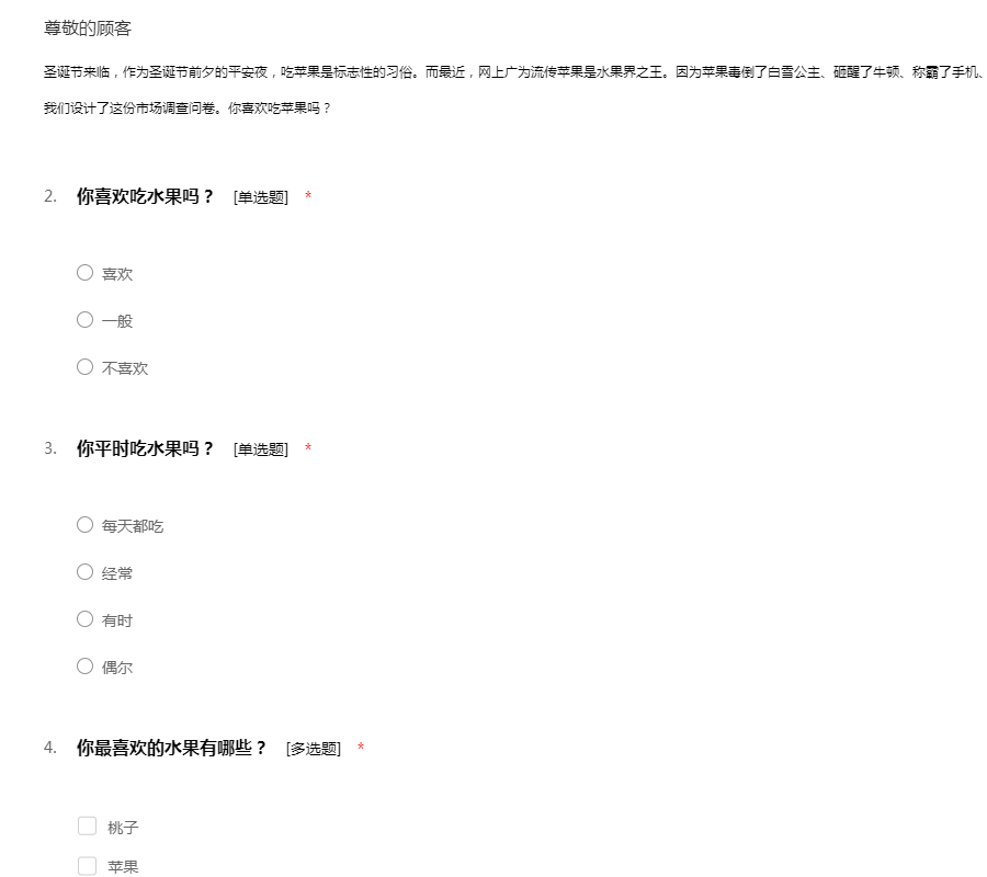 圣诞节来临,作为圣诞节前夕的平安夜,吃苹果是标志性的习俗。而最近,网上广为流传苹果是水果界之王。因为苹果毒倒了白雪公主、砸醒了牛顿、称霸了手机、主宰了广场舞,还是平安夜必吃的食物。在此,我们设计了这份市场调查问卷。你喜欢吃苹果吗?