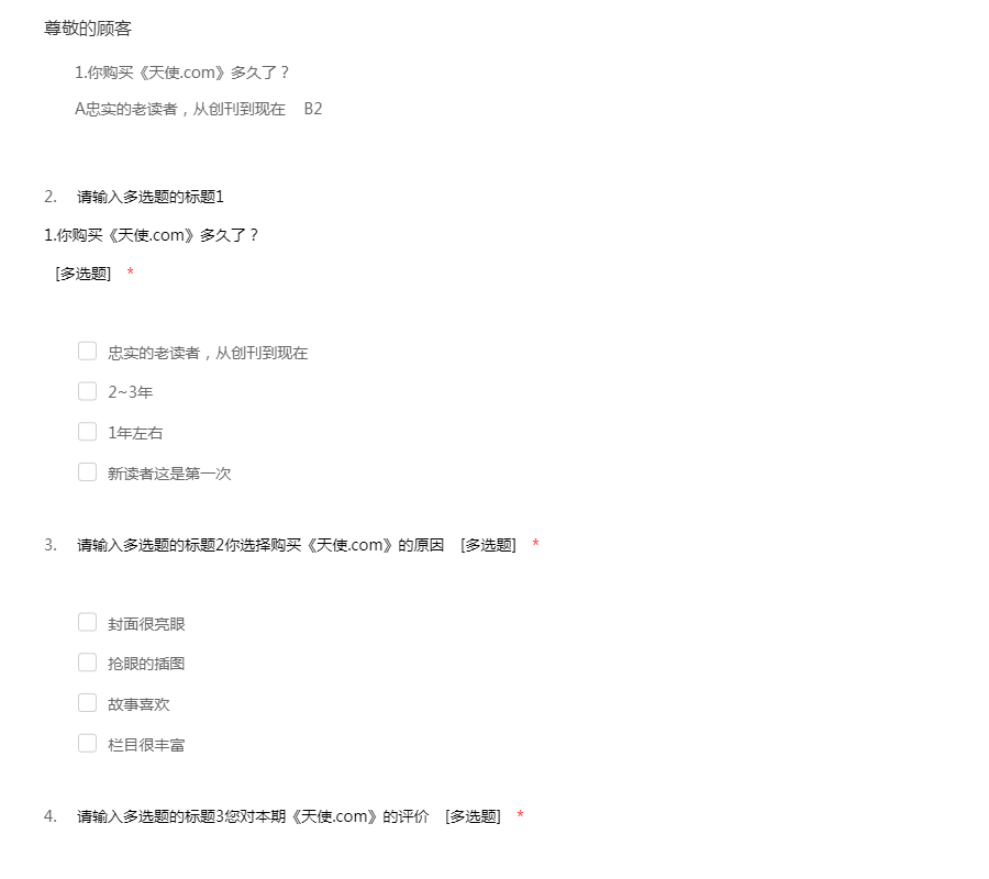 1.你购买《天使.com》多久了? A忠实的老读者,从创刊到现在 B2