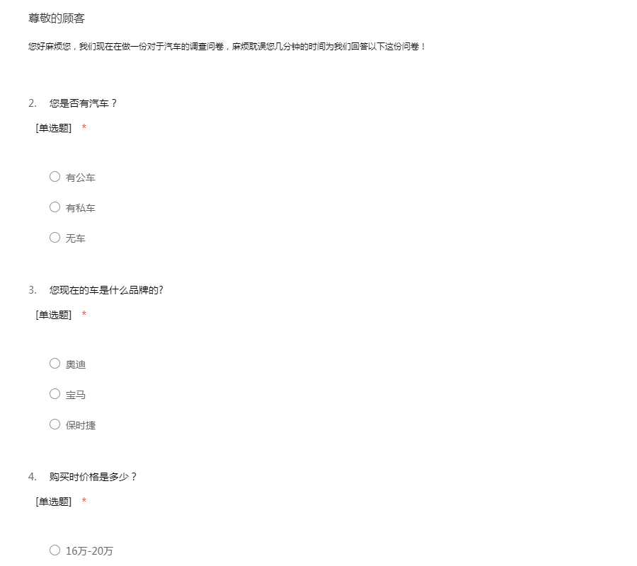 您好麻烦您,我们现在在做一份对于汽车的调查问卷,麻烦耽误您几分钟的时间为我们回答以下这份问卷!