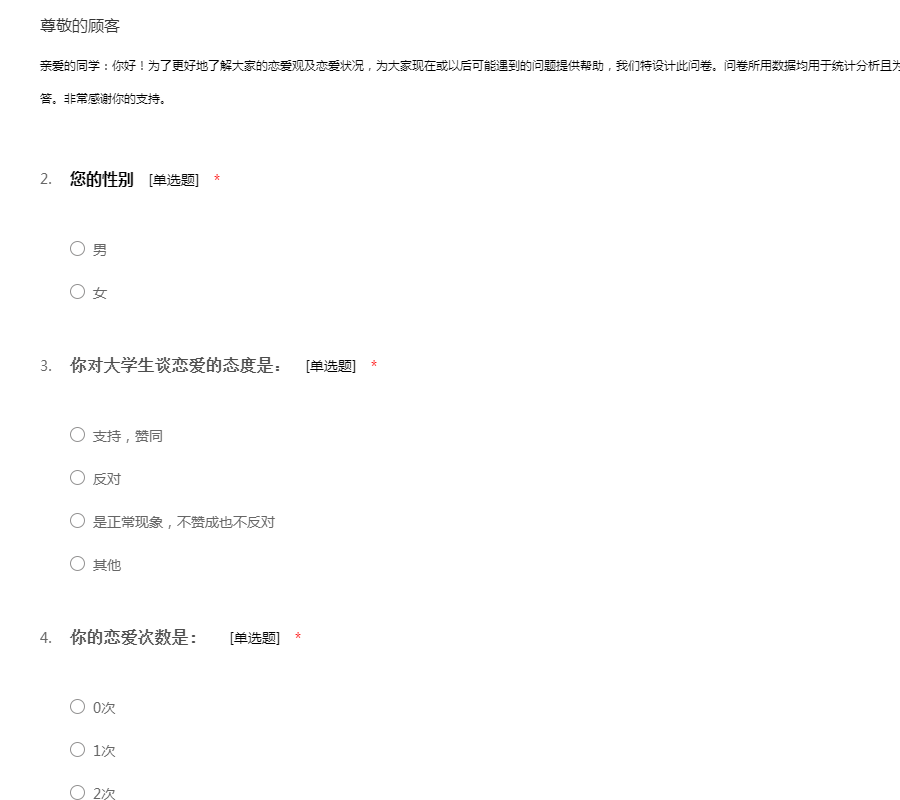 亲爱的同学:你好!为了更好地了解大家的恋爱观及恋爱状况,为大家现在或以后可能遇到的问题提供帮助,我们特设计此问卷。问卷所用数据均用于统计分析且为匿名调查,我们会保护你的隐私权,望如实回答。非常感谢你的支持。