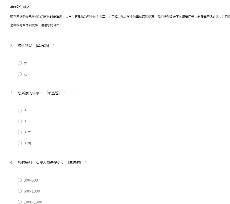 现在网络购物已经成为当代的时尚消费,大学生更是作为其中的主力军,为了解当代大学生的具体网购情况,我们特别设计了此调查问卷,此调查不记姓名,并且您所提供的数据将只用于统计分析,麻烦您在百忙之中给与帮助和支持,谢谢您的合作!