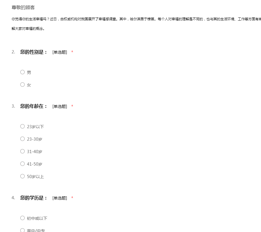 你觉得你的生活幸福吗?近日,由权威机构对我国展开了幸福感调查。其中,哈尔滨居于榜首。每个人对幸福的理解是不同的,也与其的生活环境、工作等方面有有关。在此,我们设计了这份问卷调查,想借此了解大家对幸福的概念。