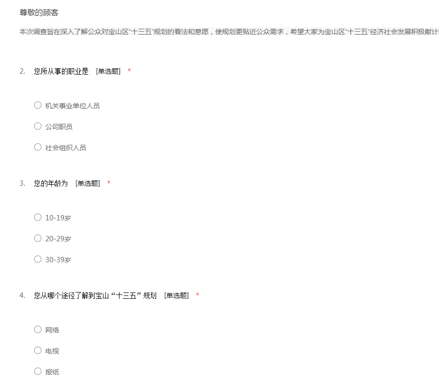 本次调查旨在深入了解公众对宝山区“十三五”规划的看法和意愿,使规划更贴近公众需求,希望大家为宝山区“十三五”经济社会发展积极献计献策。