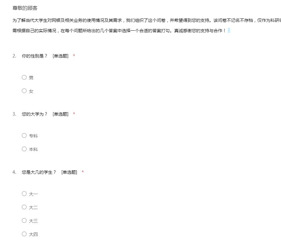 为了解当代大学生对网银及相关业务的使用情况及其需求,我们组织了这个问卷,并希望得到您的支持。该问卷不记名不存档,仅作为科研调查之用,不会侵犯您的个人隐私。您只需根据自己的实际情况,在每个问题所给出的几个答案中选择一个合适的答案打勾。真诚感谢您的支持与合作!