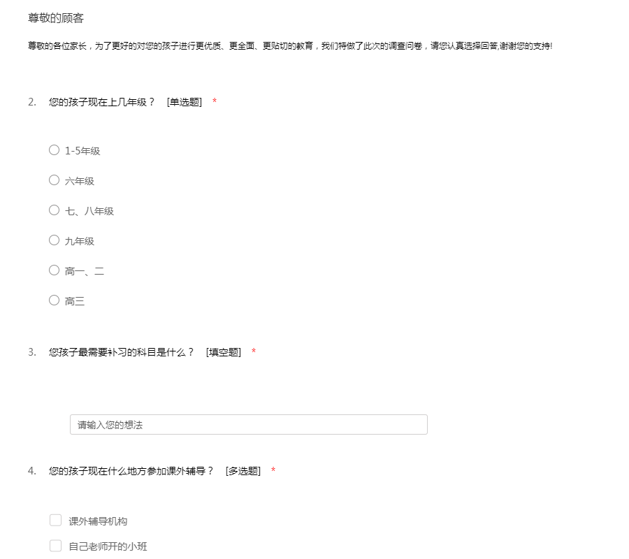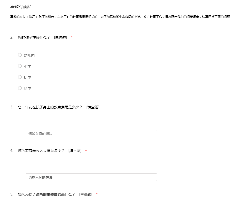 尊敬的各位家长,为了更好的对您的孩子进行更优质、更全面、更贴切的教育,我们特做了此次的调查问卷,请您认真选择回答,谢谢您的支持!