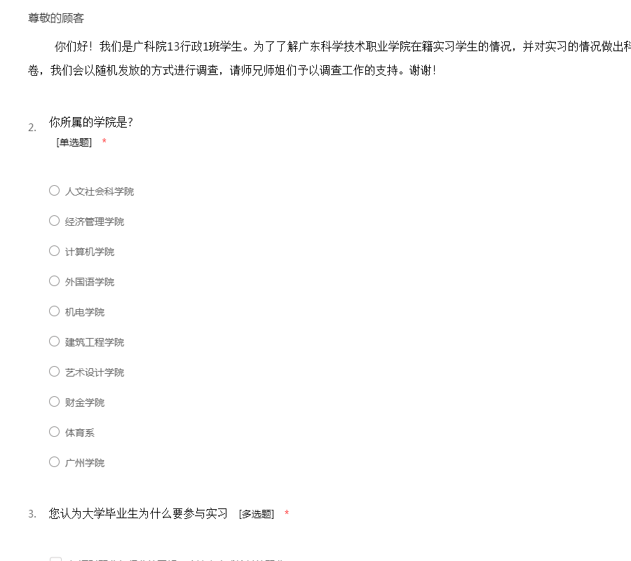 你们好!我们是广科院13行政1班学生。为了了解广东科学技术职业学院在籍实习学生的情况,并对实习的情况做出科学的分析,为此制作了一份调查问卷,我们会以随机发放的方式进行调查,请师兄师姐们予以调查工作的支持。谢谢!