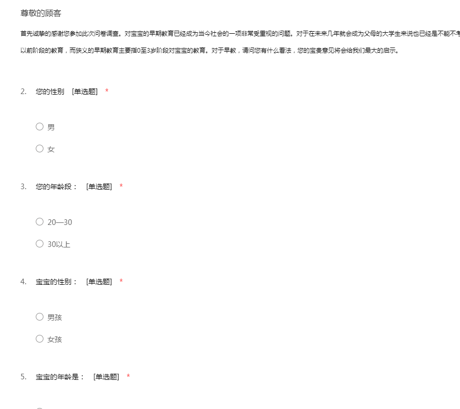 首先诚挚的感谢您参加此次问卷调查。对宝宝的早期教育已经成为当今社会的一项非常受重视的问题。对于在未来几年就会成为父母的大学生来说也已经是不能不考虑的问题。广义的早期教育指从宝宝出生到六岁以前阶段的教育,而狭义的早期教育主要指0至3岁阶段对宝宝的教育。对于早教,请问您有什么看法,您的宝贵意见将会给我们最大的启示。