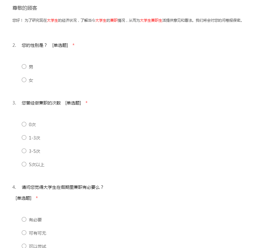 您好! 为了研究现在大学生的经济状况,了解当今大学生的兼职情况,从而为大学生兼职生活提供意见和看法。我们将会对您的问卷报保密。