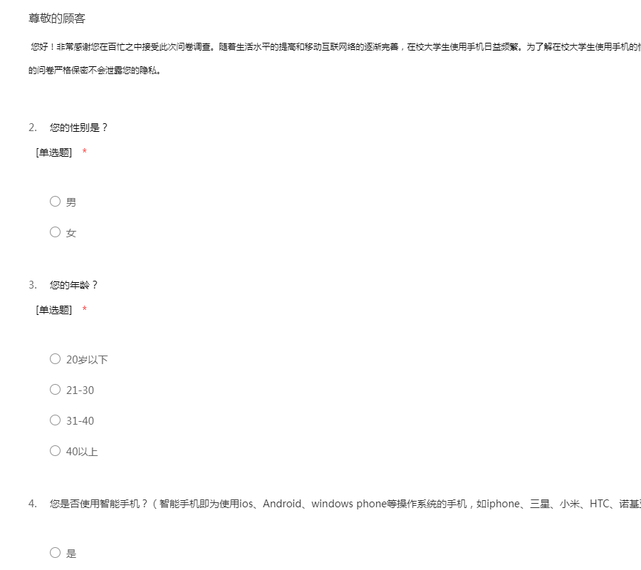 您好!非常感谢您在百忙之中接受此次问卷调查。随着生活水平的提高和移动互联网络的逐渐完善,在校大学生使用手机日益频繁。为了解在校大学生使用手机的情况设计调查问卷请您如实填写,我们将会对您的问卷严格保密不会泄露您的隐私。