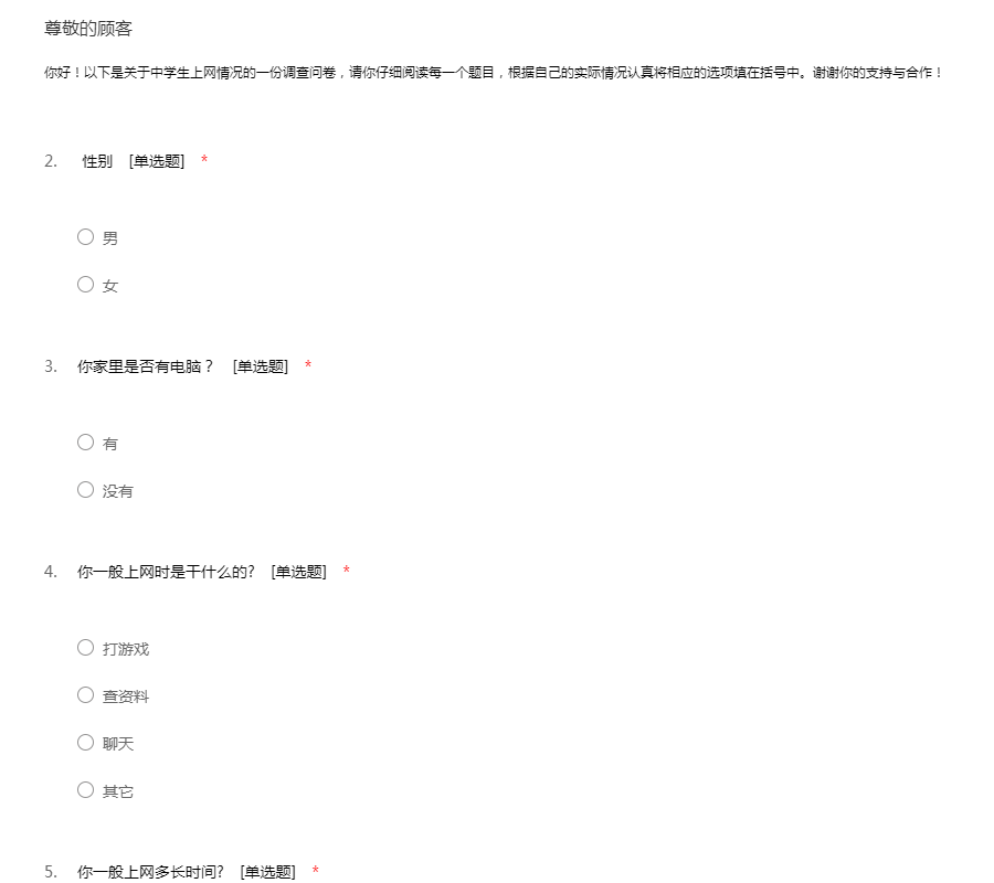 你好!以下是关于中学生上网情况的一份调查问卷,请你仔细阅读每一个题目,根据自己的实际情况认真将相应的选项填在括号中。谢谢你的支持与合作!