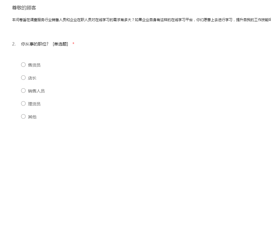 本问卷旨在调查服务行业销售人员和企业在职人员对在线学习的需求有多大?如果企业自身有这样的在线学习平台,你们愿意上去进行学习,提升自我的工作技能吗?