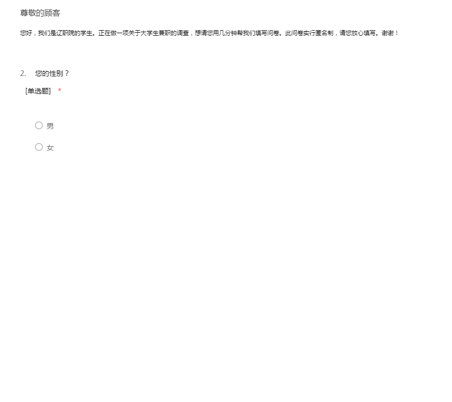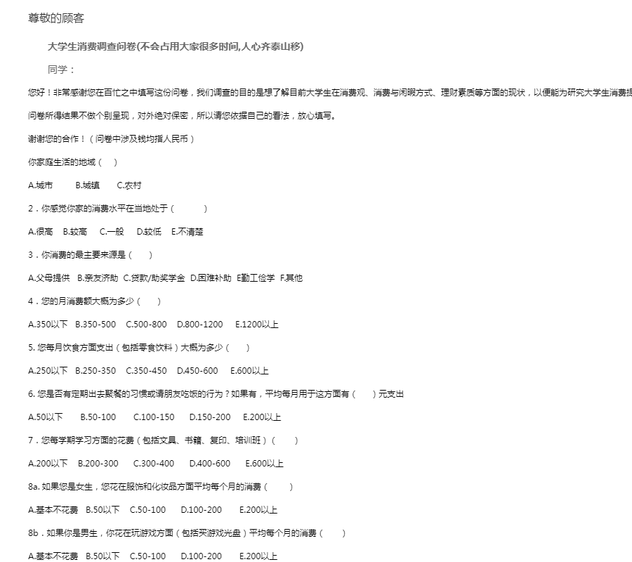 您好!非常感谢您在百忙之中填写这份问卷,我们调查的目的是想了解目前大学生在消费观、消费与闲暇方式、理财素质等方面的现状,以便能为研究大学生消费提供更多依据。本问卷各项答案无所谓好坏对错且问卷所得结果不做个别呈现,对外绝对保密,所以请您依据自己的看法,放心填写。