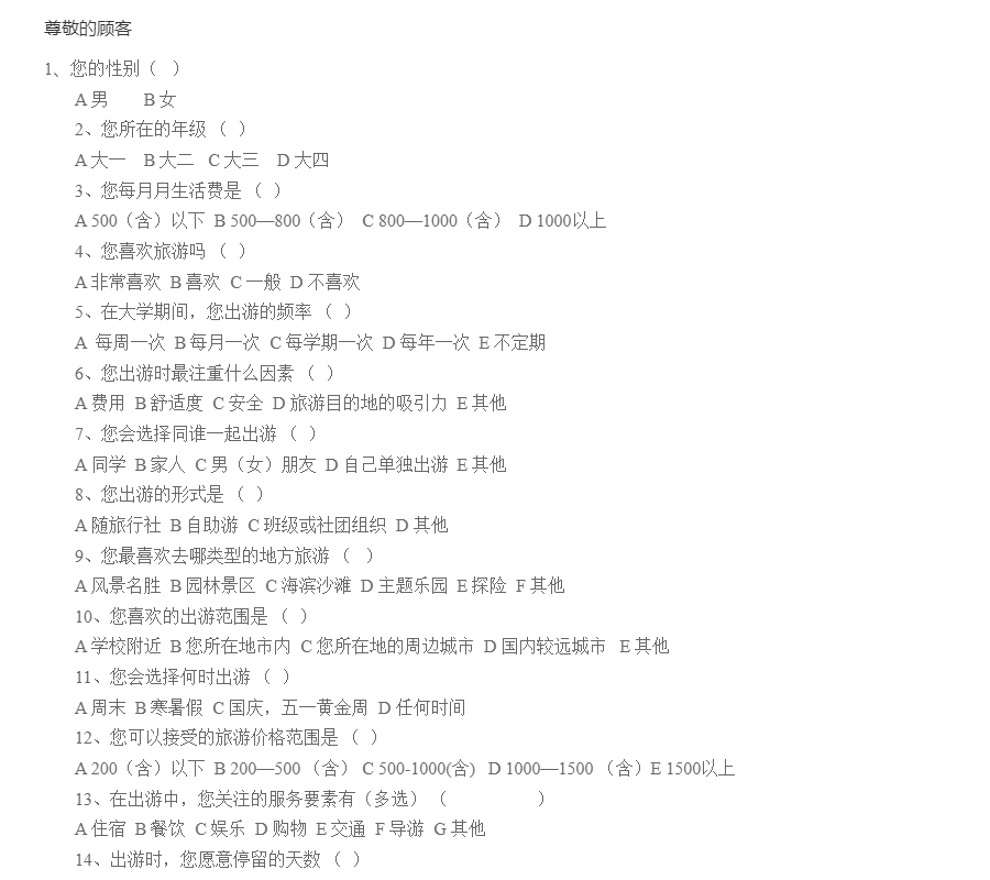 1、您的性别( ) A 男 B 女 2、您所在的年级 ( ) A 大一 B 大二 C 大三 D 大四 3、您每月月生活费是 ( ) A 500(含)以下 B 500—800(含) C 800—1000(含) D 1000以上 4、您喜欢旅游吗 ( ) A 非常喜欢 B 喜欢 C 一般 D 不喜欢 5、在大学期间,您出游的频率 ( ) A 每周一次 B 每月一次 C 每学期一次 D 每年一次 E 不定期 6、您出游时最注重什么因素 ( ) A 费用 B 舒适度 C 安全 D 旅游目的地的吸引力 E 其他 7、您会选择同谁一起出游 ( ) A 同学 B 家人 C 男(女)朋友 D 自己单独出游 E 其他 8、您出游的形式是 ( ) A 随旅行社 B 自助游 C 班级或社团组织 D 其他 9、您最喜欢去哪类型的地方旅游 ( ) A 风景名胜 B 园林景区 C 海滨沙滩 D 主题乐园 E 探险 F 其他 10、您喜欢的出游范围是 ( ) A 学校附近 B 您所在地市内 C 您所在地的周边城市 D 国内较远城市 E 其他 11、您会选择何时出游 ( ) A 周末 B 寒暑假 C 国庆,五一黄金周 D 任何时间 12、您可以接受的旅游价格范围是 ( ) A 200(含)以下 B 200—500 (含) C 500-1000(含) D 1000—1500 (含)E 1500以上 13、在出游中,您关注的服务要素有(多选) ( ) A 住宿 B 餐饮 C 娱乐 D 购物 E 交通 F 导游 G 其他 14、出游时,您愿意停留的天数 ( ) A 一天 B 两天 C 三天 D 四天或以上 15、您是如何看待大学生旅游的﹍﹍﹍﹍﹍﹍﹍﹍﹍﹍﹍﹍﹍﹍﹍﹍﹍﹍﹍﹍