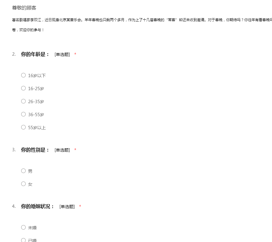 著名歌唱家李双江,近日现身北京某音乐会。羊年春晚也只剩两个多月,作为上了十几届春晚的“常客”却还未收到邀请。对于春晚,你期待吗?你往年有看春晚吗?对于春晚的种种问题,我们设计了这份调查问卷,欢迎你的参与!