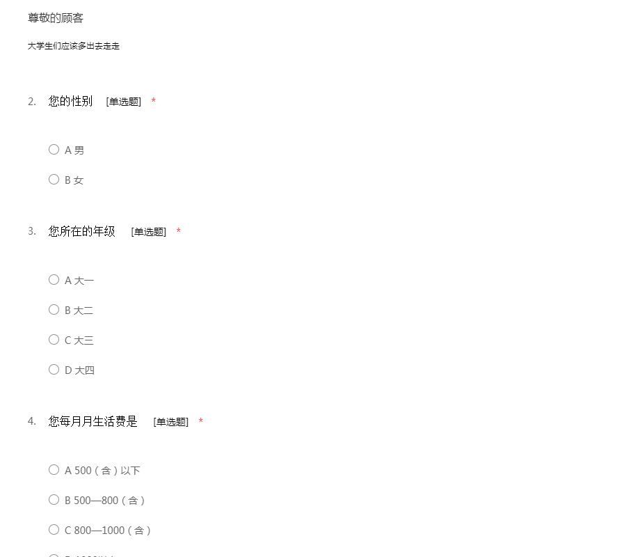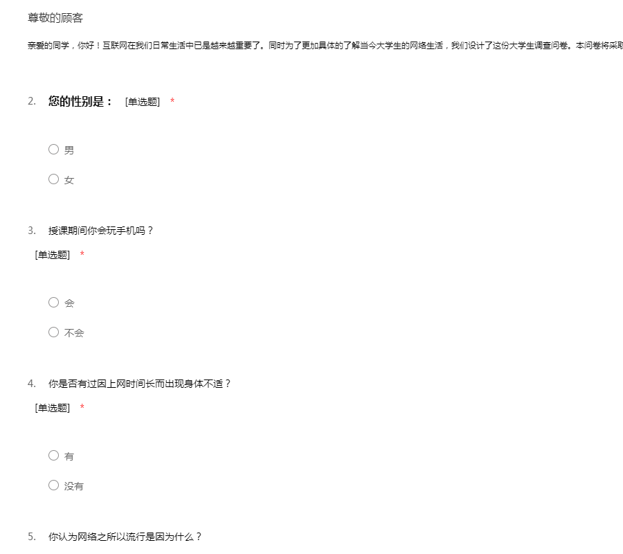 亲爱的同学,你好!互联网在我们日常生活中已是越来越重要了。同时为了更加具体的了解当今大学生的网络生活,我们设计了这份大学生调查问卷。本问卷将采取匿名制,所以您可以放心填写。感谢你的配合!
