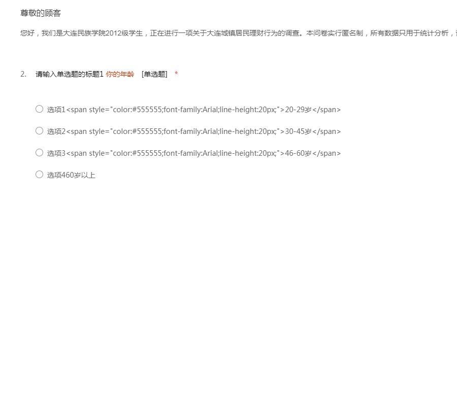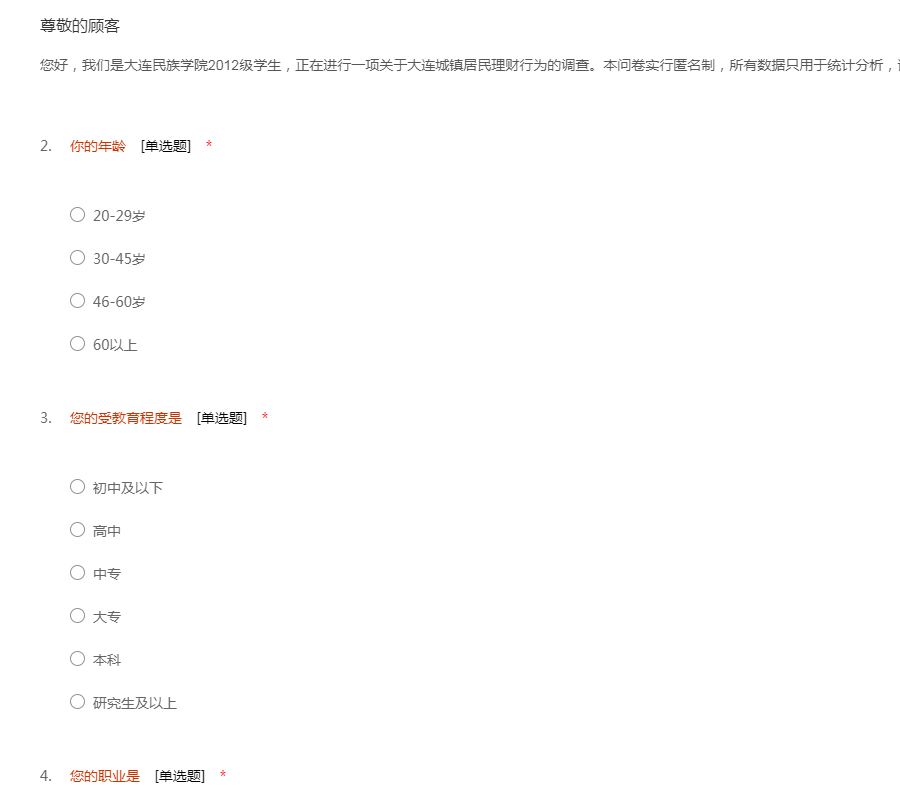 您好,我们是大连民族学院2012级学生,正在进行一项关于大连城镇居民理财行为的调查。本问卷实行匿名制,所有数据只用于统计分析,请您放心填写。