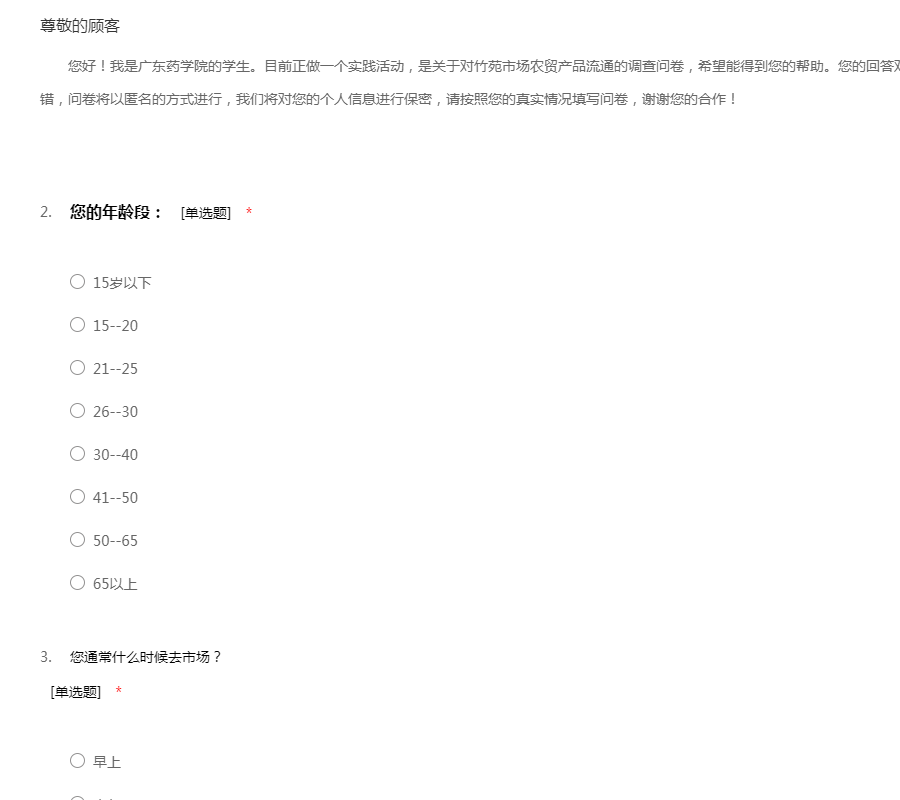 您好!我是广东药学院的学生。目前正做一个实践活动,是关于对竹苑市场农贸产品流通的调查问卷,希望能得到您的帮助。您的回答对我来说有非常重要的意义,答案不分对错,问卷将以匿名的方式进行,我们将对您的个人信息进行保密,请按照您的真实情况填写问卷,谢谢您的合作!