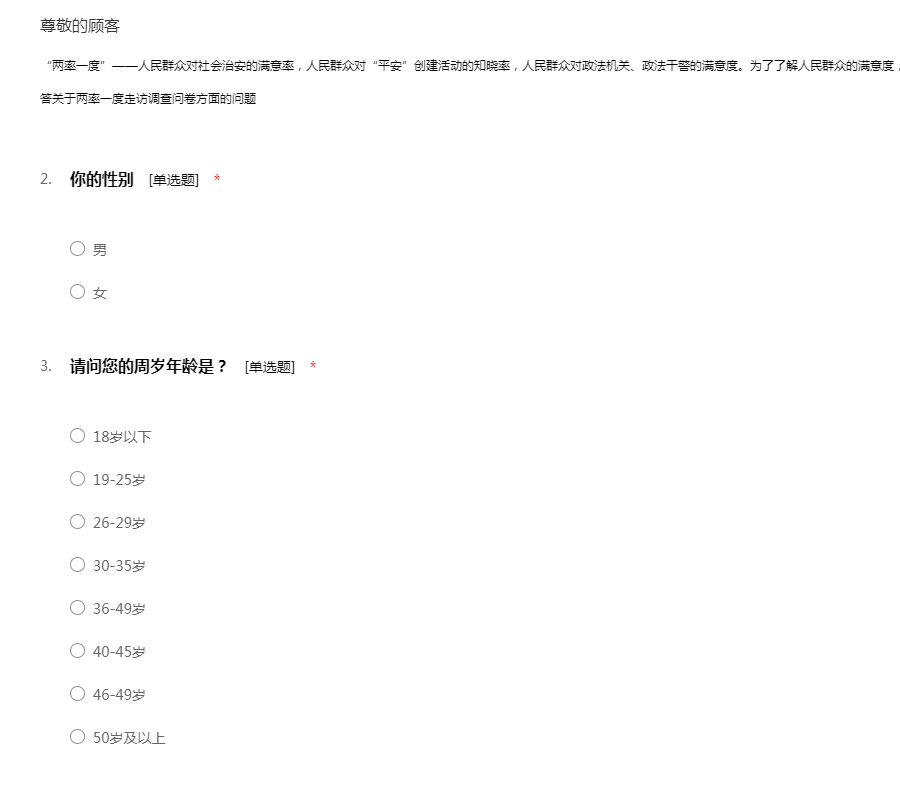 “两率一度”——人民群众对社会治安的满意率,人民群众对“平安”创建活动的知晓率,人民群众对政法机关、政法干警的满意度。为了了解人民群众的满意度,做了一份两率一度走访调查问卷,谢谢你配合回答关于两率一度走访调查问卷方面的问题