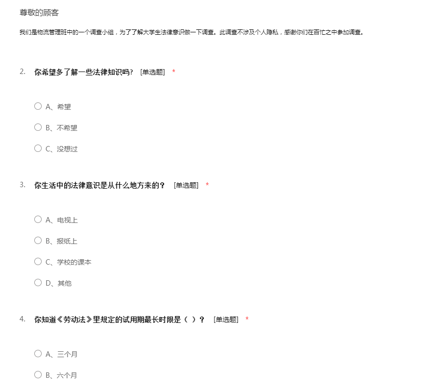 我们是物流管理班中的一个调查小组,为了了解大学生法律意识做一下调查。此调查不涉及个人隐私,感谢你们在百忙之中参加调查。