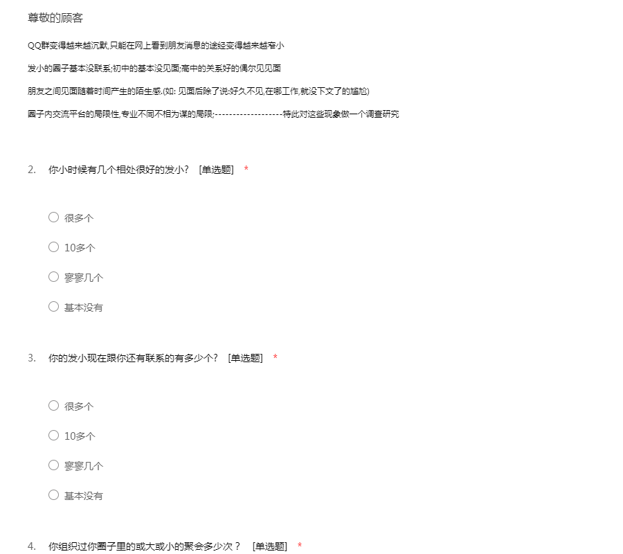 QQ群变得越来越沉默,只能在网上看到朋友消息的途经变得越来越窄小 发小的圈子基本没联系;初中的基本没见面;高中的关系好的偶尔见见面 朋友之间见面随着时间产生的陌生感.(如: 见面后除了说:好久不见,在哪工作,就没下文了的尴尬) 圈子内交流平台的局限性,专业不同不相为谋的局限;-------------------特此对这些现象做一个调查研究
